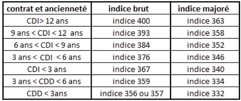 Nous avons obtenu l’indice majoré 332 pour les trois premières années de CDD (doc 2), ce qui constitue une petite amélioration, loin d’être suffisante cependant : +14 euros par mois. Les revalorisations suivantes ont lieu tous les 3 ans : 334 au bout de 3 ans de CDD. Lors du passage en CDI , puis tous les 3 ans, l’augmentation prévoit 6 points d’indice supplémentaires, comme le prévoit le cadre de gestion national.